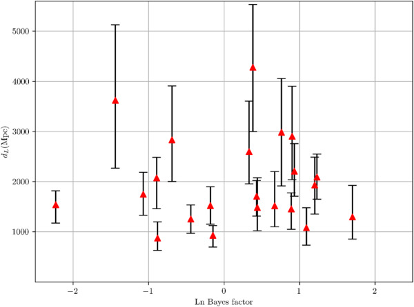 Figure 7. The natural logarithm of the Bayes factors of massive gravity versus standard model for selected GW events of BBH in GWTC-2.1 and GWTC-3. Results are displayed with 1σ credible interval for the luminosity distance. |