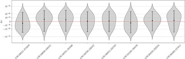 Figure 2. The posterior distribution of Δγ for selected GW events of BBH in GWTC-2.1 and GWTC-3 (90% credible interval). We selected a modified logarithmic prior (refer to equation (6) in [49]) for the prior distribution of Δγ, which encompasses both negative and non-negative values. |