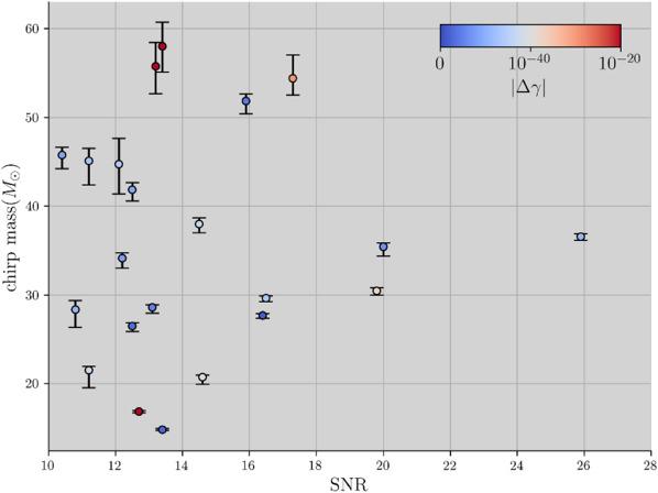 Figure 5. The median of the posterior distribution of Δγ for selected GW events of BBH in GWTC-2.1 and GWTC-3, represented by the color of points. Results are displayed with 1σ credible interval for the chirp mass. |