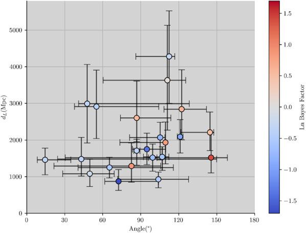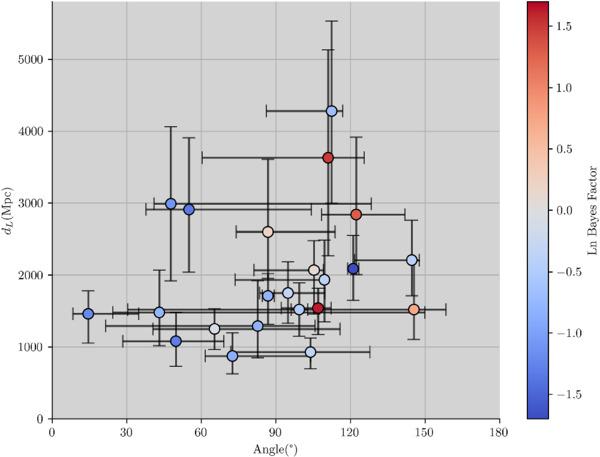 Figure 6. The natural logarithm of the Bayes factors of WEP violation model versus standard model for selected GW events of BBH in GWTC-2.1 and GWTC-3, represented by the color of points. Results are displayed with 1σ credible interval for the angle and luminosity distance. |