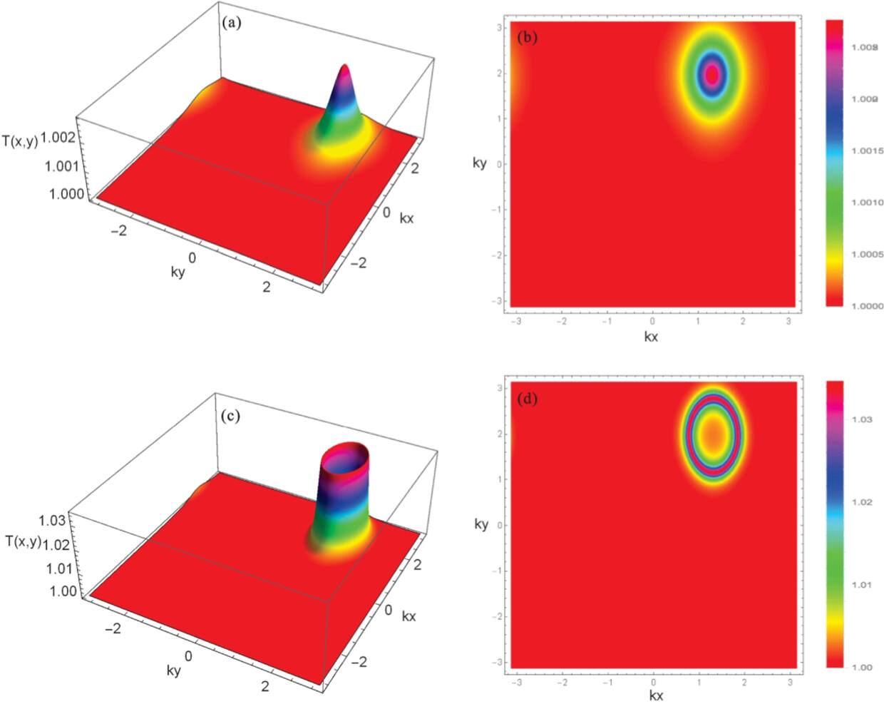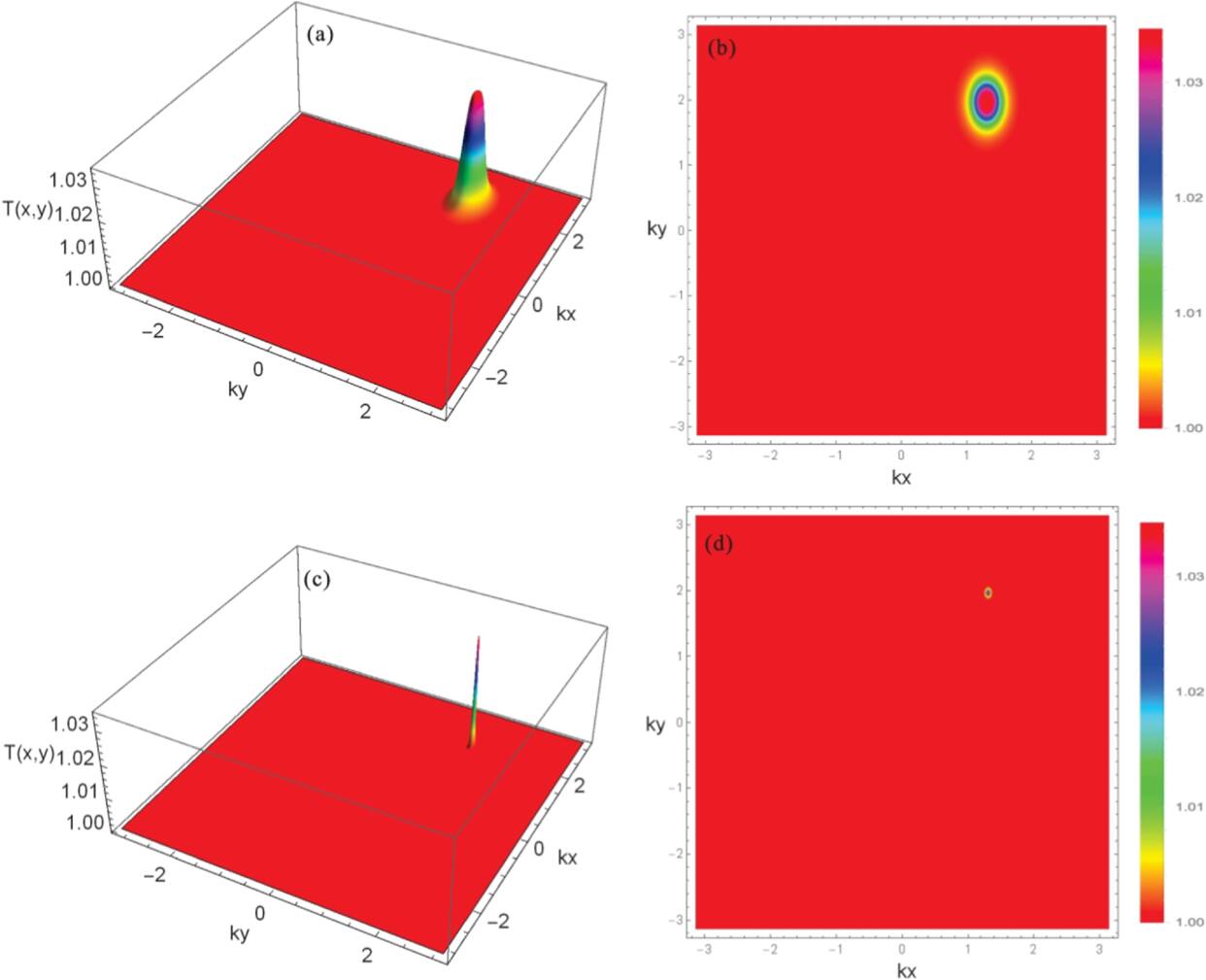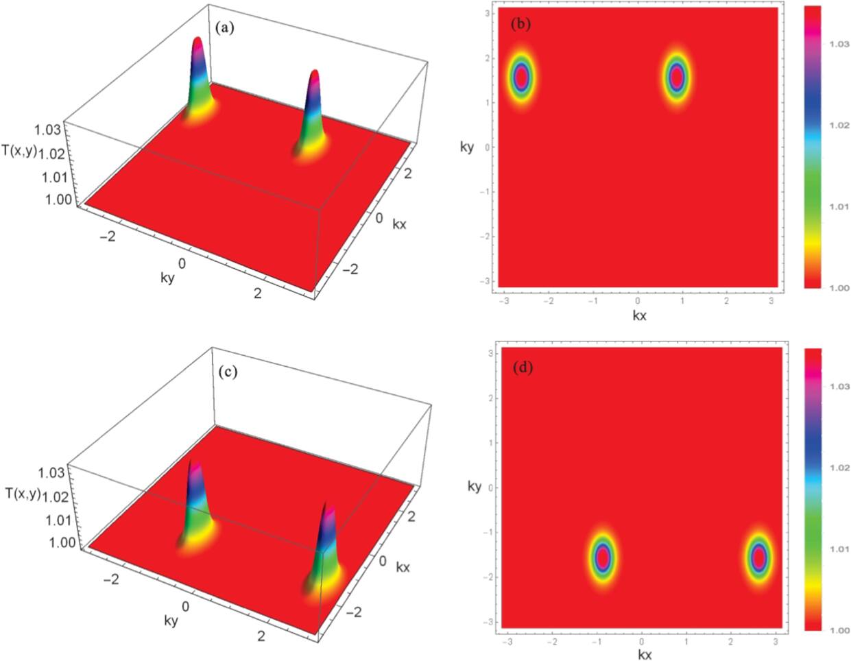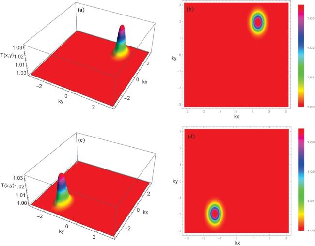 Figure 3. Transmission spectrum versus (kx, ky). The parameters selected for this analysis include (a) and (b) with η1 = 0.6 and η2 = − 0.4, and (c) and (d) show η1 = − 0.6 and η2 = 0.4. The other parameters are the same as those used in figure 2.