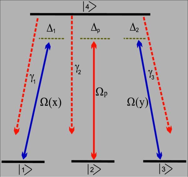 Figure 1. The energy-level diagram of the tripod-type four-level system in a 87Rb atomic structure, including the hyperfine level configuration and the interactions with the laser fields. The level diagram contains one excited state (∣4〉 and three lower states (∣1〉, ∣2〉 and ∣3〉. Ωp represent the probe field Rabi frequency, whereas standing waves are denoted by Ω(x) and Ω(y).