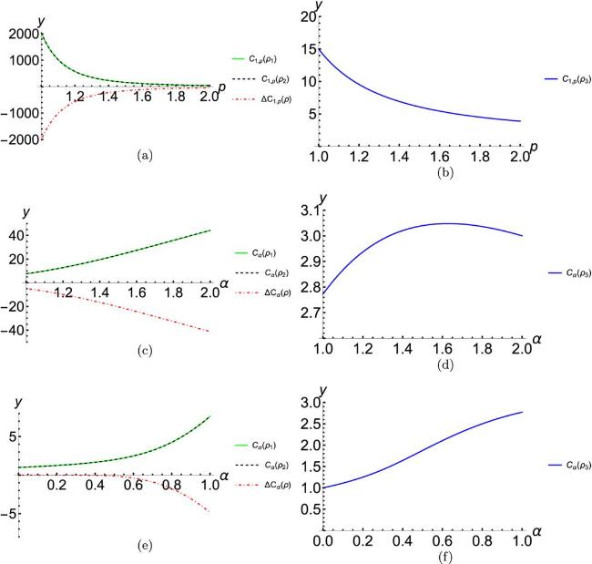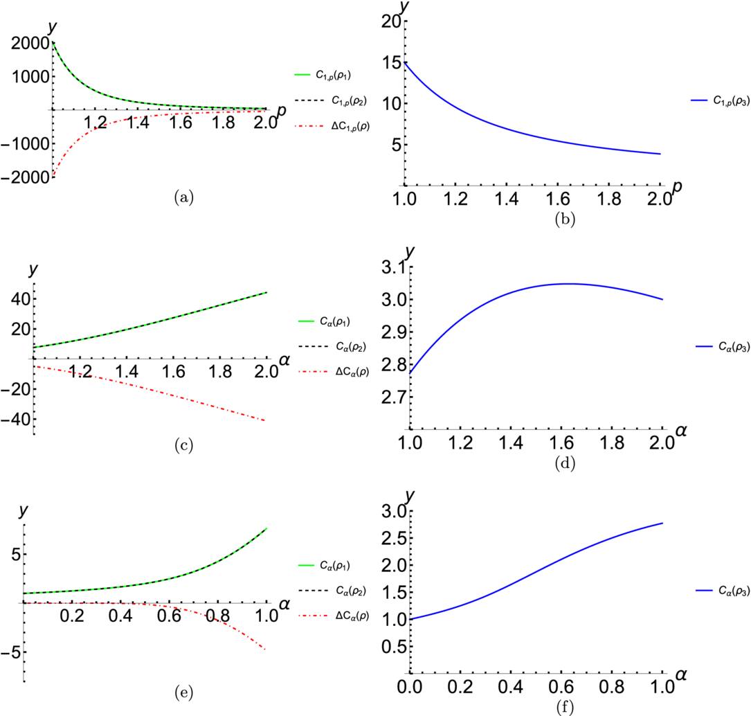 Figure 1. Subfigures (a) and (b) ((c), (d), (e) and (f)) are for the case that the coherence based on the l1,p norm (Tsallis relative α entropy). (a), (b) The coherence with respect to H (green), U (black dashed), F† (blue) and the variations of coherence based on the l1,p norm (red dot-dashed). (c), (d) The coherence with respect to H (green), U (black dashed), F† (blue) and the variations of coherence based on the Tsallis relative α entropy (red dot-dashed), where α ∈ (1, 2]. (e), (f) The coherence with respect to H (green), U (black dashed), F† (blue) and the variations of coherence based on the Tsallis relative α entropy (red dot-dashed), where α ∈ (0, 1). |