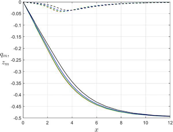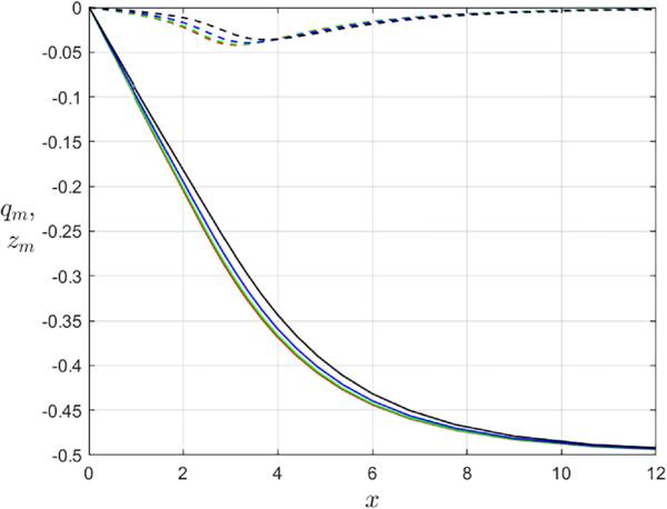 Figure 10. Functions of magnetic charge ${q}_{m}\left(x\right)$ (solid) and ‘magnetic’ neutral charge ${z}_{m}\left(x\right)$ (dash-dotted) for the Type II half-dyon solutions with n = 1, η = 0 (red), η = 0.2 (green), η = 0.3 (blue), and η = 0.4 (black).