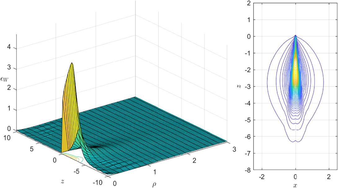 The weighted energy density ϵW and its contour of the half-dyon solution when n = 1, η = 0.1 is plotted in figure 4. The weighted energy density shows an elongated balloon with the negative z-axis as its axis of symmetry, been blown from its opening at the origin. The results are in tandem with figure 1 and confirms that the half-dyon is concentrated along the negative z-axis, extending from the origin at r = 0 over a finite length.