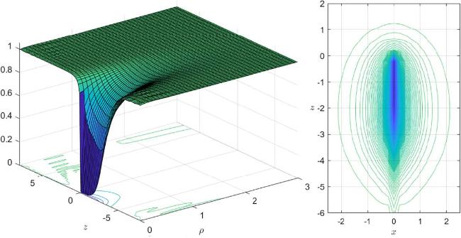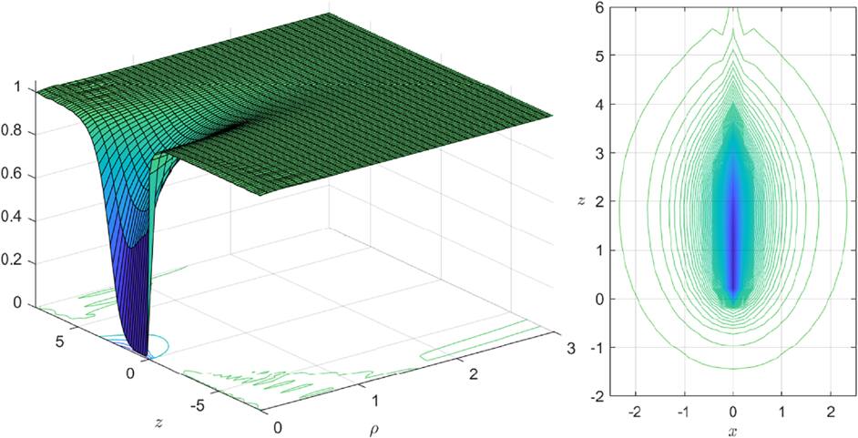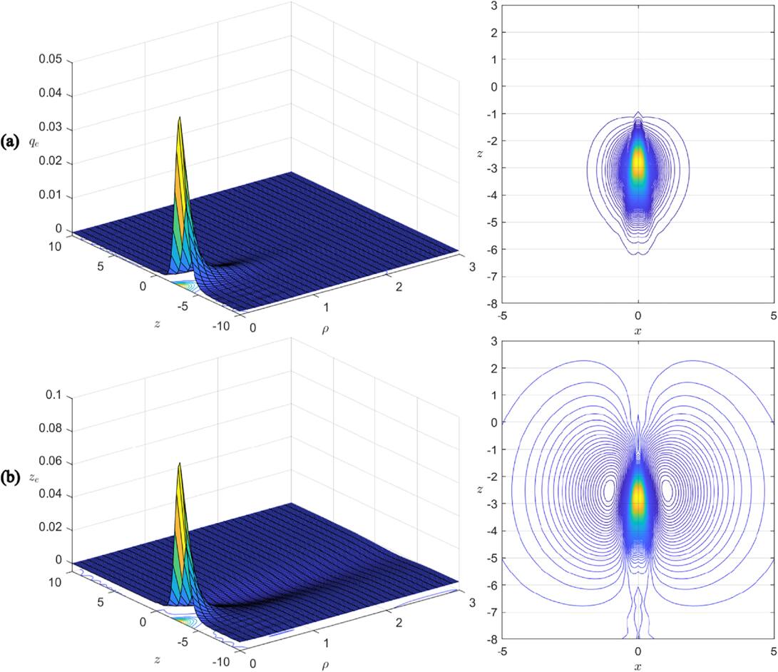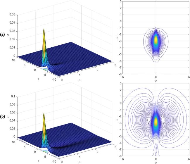 Hence our solutions indicate that if a monopole undergoes distortion (due to excitation), neutral charge densities (with minute strength) would emerge, but the overall neutral charges would remain zero. There is however a crucial difference between zm and ze. For zm, its positive charge and negative charge are adjacently distributed along the negative z-axis, figure 6(c). For ze, the positive charges are distributed along the negative z-axis extending from the origin, while its negative charge are distributed along a finite tube encircling the positive charge, figure 5(b).