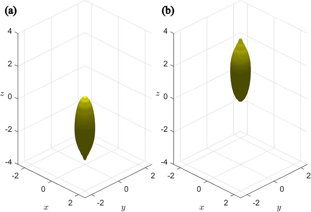 The Type II solutions have the exact same critical value ηc as their corresponding Type I solutions, which are 0.5001, 0.5005 and 0.1726 for n = 1, 2 and 3 respectively. Despite the opposite magnetic charge, both types of solutions share identical values for electric qe and ‘electric’ neutral ze charges. Comparison of figures 1 and 8 demonstrates that, in terms of structure, Type II half-dyons are perfect mirror images of Type I half-dyons across the $\rho =\sqrt{{x}^{2}+{y}^{2}}$ plane. These findings imply that the emergence of magnetic monopoles (or dyons) may occur in pairs, hinting at the potential for monopole pair production.