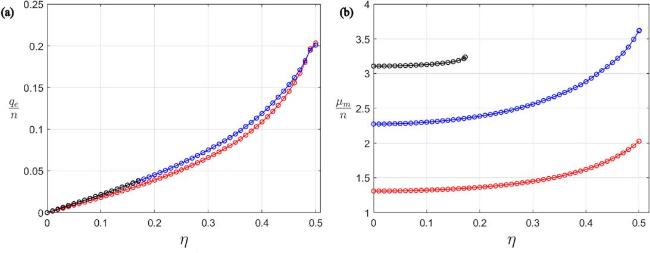 Figure 11. Plots of (a) qe/n (in unit of 4π/e) versus η, (b) μm/n (in unit of 1/e) versus η; of the Type I half-dyon solutions for n = 1 (red), n = 2 (blue) and n = 3 (black).