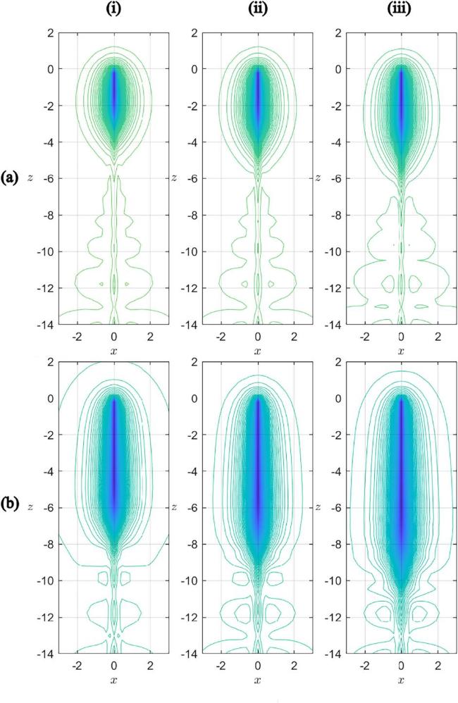 Figure 2. Higgs modulus contour of the Type I half-dyon for (a) n = 1 and (b) n = 2, at (i) η = 0, (ii) η = 0.3, and (iii) η = 0.4.