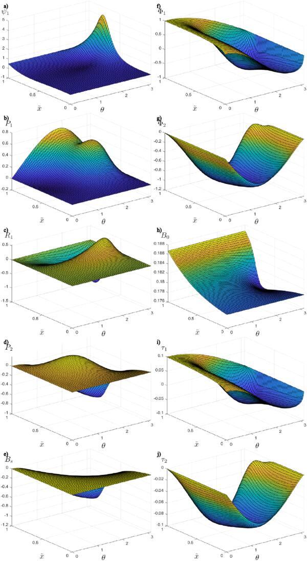 Figure 3. Profile functions (a) ψ1, (b) P1, (c) R1, (d) P2, (e) Bs, (f) Φ1, (g) Φ2, (h) ${\tilde{B}}_{0}$, (i) τ1 and (j) τ2, of Type I half-dyon for n = 1, η = 0.1, over the region of $0\,\leqslant \,\tilde{x}\,\leqslant \,1$, 0 ≤ θ ≤ π.