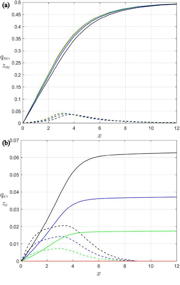 Figure 7. Functions of (a) magnetic charge ${q}_{m}\left(x\right)$ (solid) and ‘magnetic’ neutral charge ${z}_{m}\left(x\right)$ (dash-dotted), and (b) electric charge ${q}_{e}\left(x\right)$ (solid) and ‘electric’ neutral charge ${z}_{e}\left(x\right)$ (dash-dotted) versus x; for the Type I half-dyon solutions with n = 1, η = 0 (red), η = 0.2 (green), η = 0.3 (blue), and η = 0.4 (black).