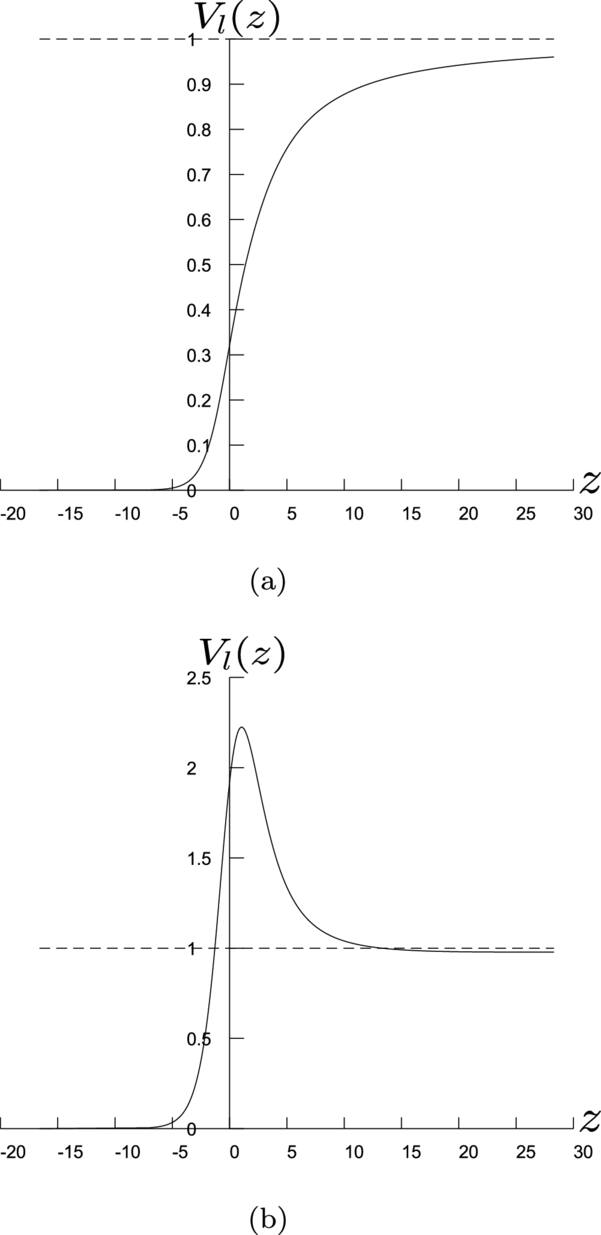We plot several examples of Vl(z) in figure 1. From these examples one can notice that Vl(z) → 0 for z → −∞ and Vl(z) → μ2 for z → +∞ which leads to the following asymptotic behavior of the radial equation,