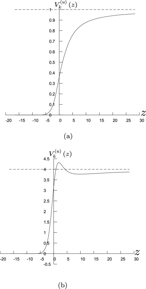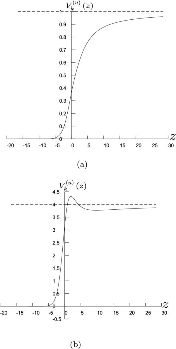 Figure 2. Examples of ${V}_{\kappa }^{(u)}\left(\varepsilon ,z\right)$ for (a) ε = 0.2, κ = −1, and μ = 1; (b) ε = 4, κ = 4, and μ = 2.