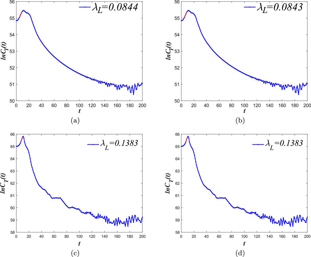 Figure 3. The diagrams of the OTOCs: μ = 5 and β = 10. The energy cutoff is chosen as ${E}_{{\rm{\min }}}=0.5$ and ${E}_{{\rm{\max }}}=100$. The red line regime is nearly linear, and its slope corresponds to the Lyapunov exponent. (a) and (b) are for the scalar fields while (c) and (d) are for the spinor fields. (a) and (c) are the total OTOCs while (b) and (d) only include the contributions of the bound states near the horizon. Therefore, the main part of the Lyapunov exponent arises from the bound states.