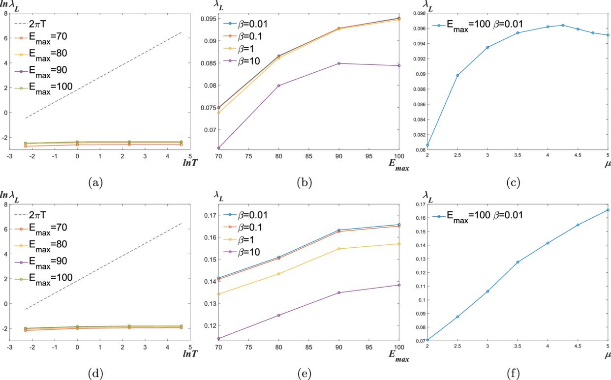 Figure 4. (a) and (d) show the temperature dependence of the OTOC. The dashed line corresponds to the chaos bound. μ = 5. (b) and (e) show the cutoff ${E}_{{\rm{\max }}}$ dependence of the OTOC. μ = 5. (c) and (f) show the μ dependence of the OTOC. ${E}_{{\rm{\max }}}=100$ and β = 0.01. (a), (b), and (c) are for the scalar field. (d), (e), and (f) are for the spinor field.