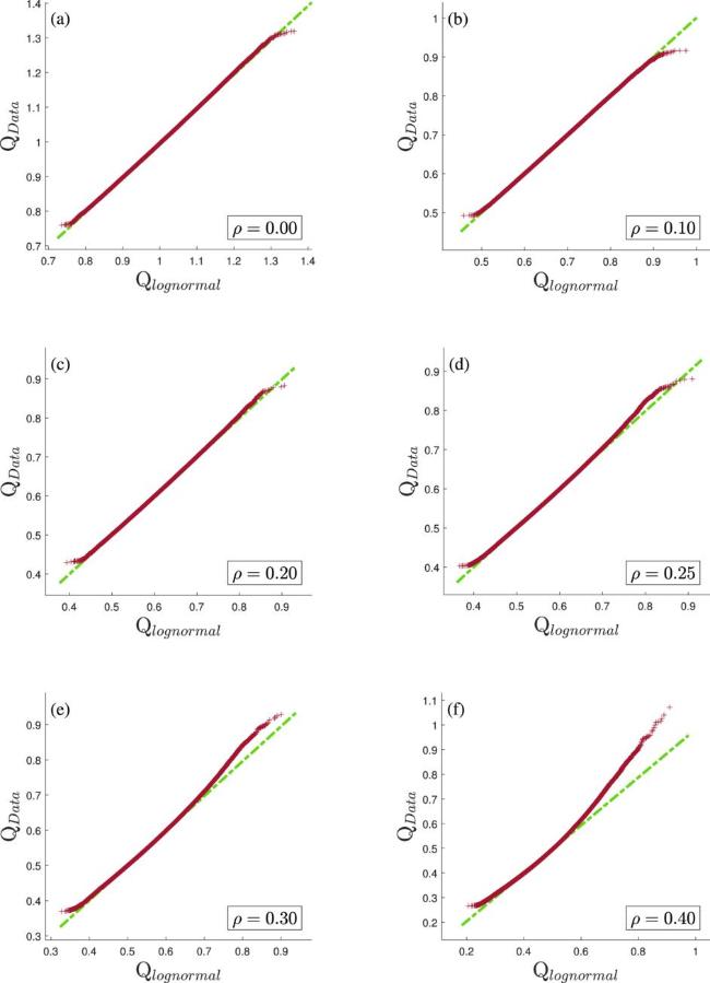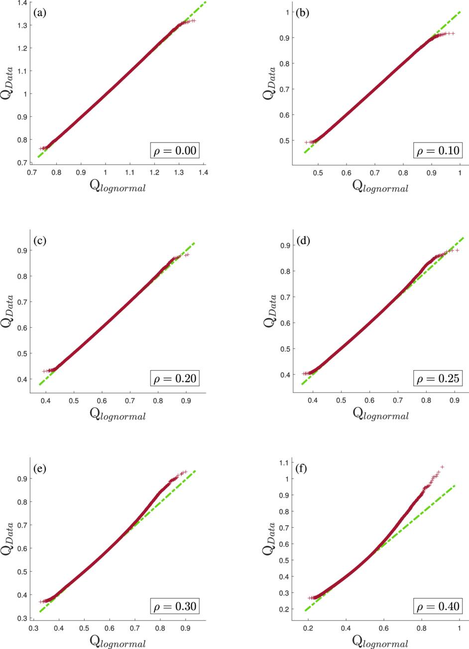 Figure 10. The Q–Q plots of simulation data of the squared interface width for the spatially correlated KPZ equation versus lognormal distribution with different ρ. |