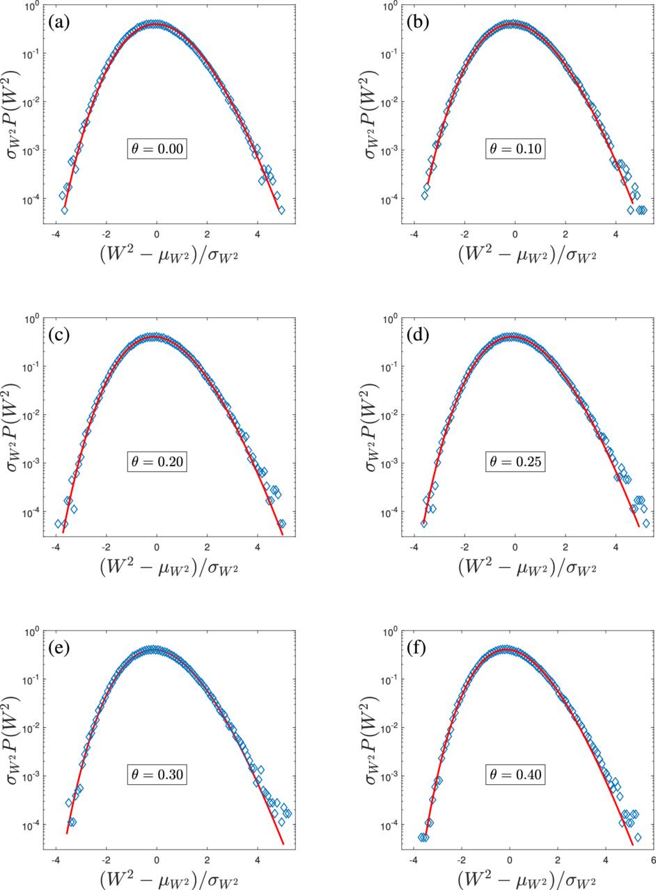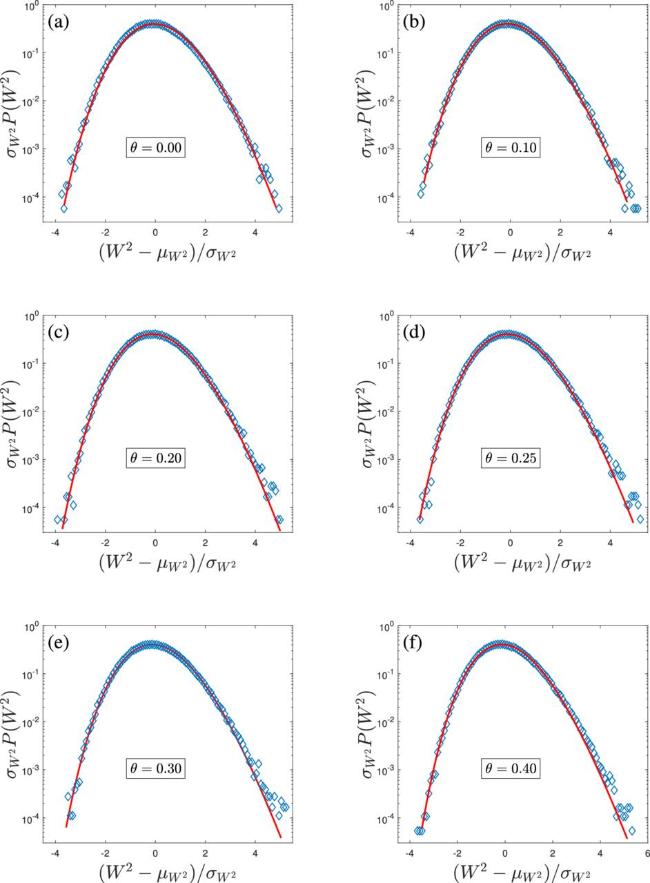 Figure 1. The rescaled distributions for W2(L, t) in the temporally correlated KPZ equation with different θ: (a) θ = 0.00, (b) θ = 0.10, (c) θ = 0.20, (d) θ = 0.25, (e) θ = 0.30, (f) θ = 0.40. Here, ${\mu }_{{W}^{2}}$ and ${\sigma }_{{W}^{2}}$ are the mean value and standard deviation of W2(L, t), respectively. All data are averaged over 105 independent realizations. Comparison with lognormal distribution (red solid line) is provided correspondingly. |