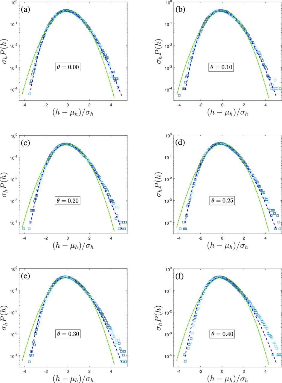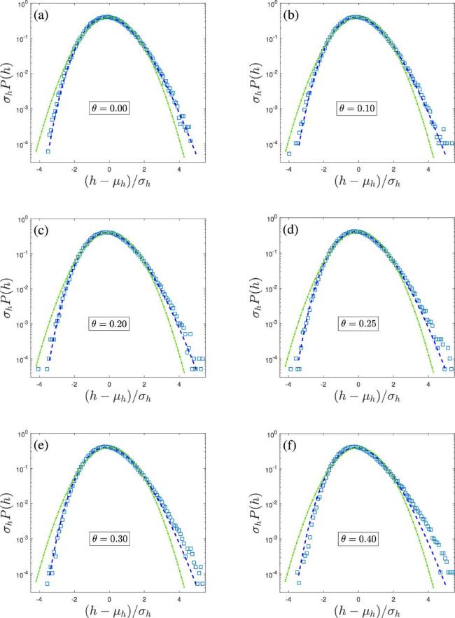 Figure 2. The rescaled distributions for the interface height in the temporally correlated KPZ equation with different θ: (a) θ = 0.00, (b) θ = 0.10, (c) θ = 0.20, (d) θ = 0.25, (e) θ = 0.30, (f) θ = 0.40. Here, μh and σh are the mean value and standard deviation of the interface height, respectively. Comparisons with TW-GOE (blue dash line) and Gaussian distribution (green dash–dot line) are provided correspondingly. |