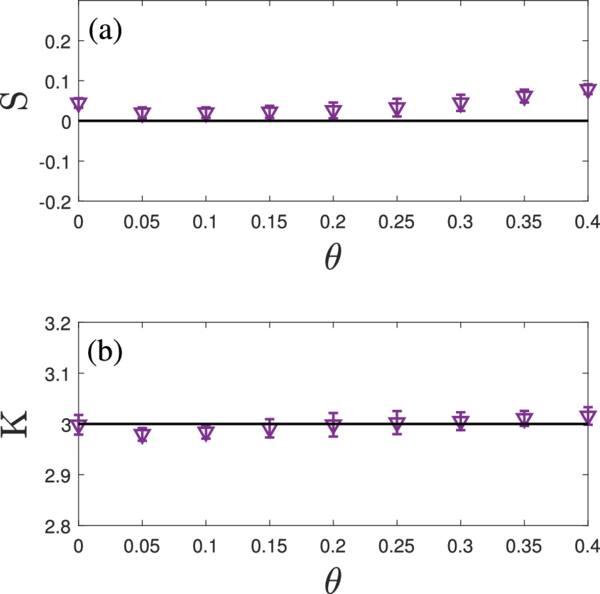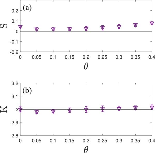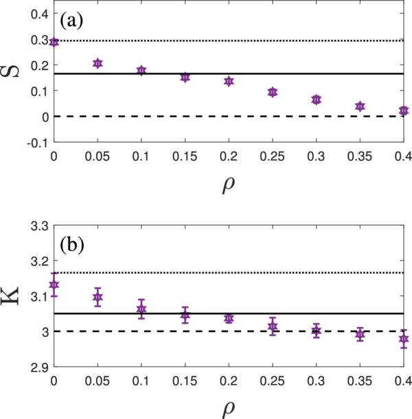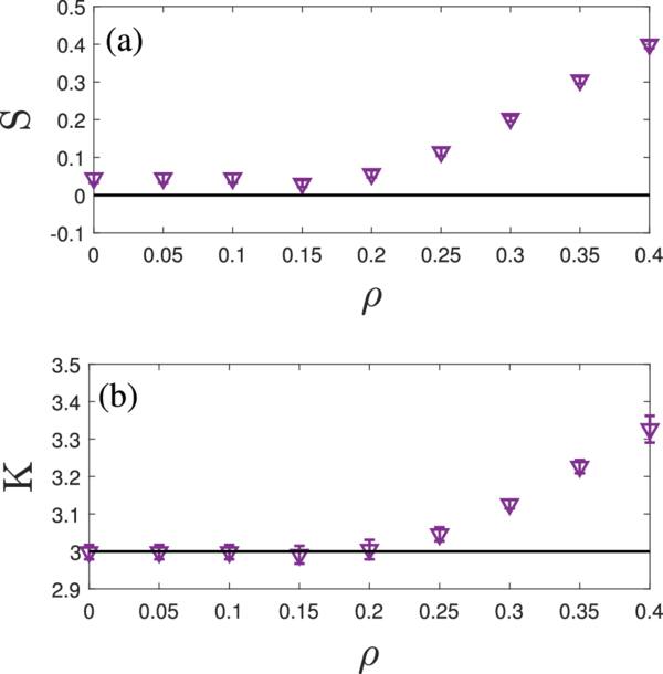 Figure 8. The estimated values of (a) skewness S and (b) kurtosis K with error bars for probability distributions of the logarithm of the squared interface width W2(L, t) (purple downward-pointing triangle) in the spatially correlated KPZ system with different ρ, which compare quantitatively with the Gaussian distribution values (solid lines). |
