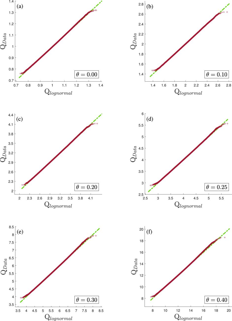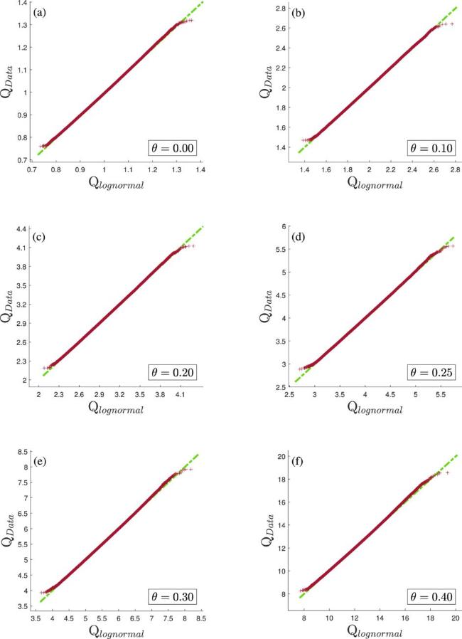 Figure 5. The Q–Q plots of simulation data of the squared interface width for the temporally correlated KPZ equation versus lognormal distribution with different θ. |