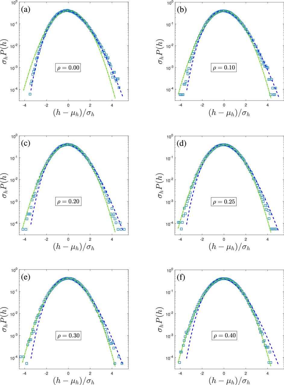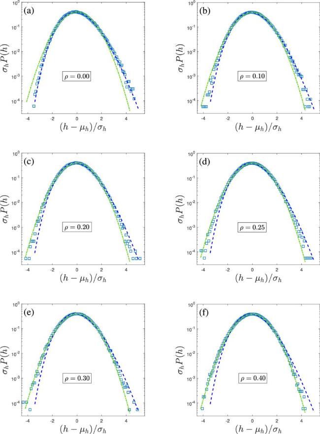 Figure 7. The rescaled distributions for the interface height in the spatially correlated KPZ system with different ρ. Here μh and σh are the mean value and standard deviation of the interface height, respectively. All parameters chosen here are the same as those in figure 6. The suitable distributions are provided for comparison: TW-GOE (blue dash line) and Gaussian distribution (green dash–dot line). |