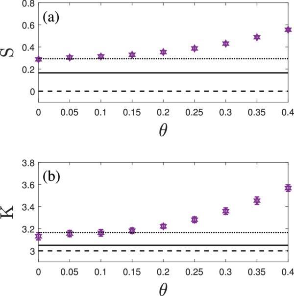Figure 4. The estimated values of (a) skewness S and (b) kurtosis K with error bars for height distributions for the KPZ model with long-range temporal correlation. The TW-GOE values (dotted lines), TW-GSE values (solid lines) and Gaussian distribution values (dash lines) are provided for quantitative comparison. |