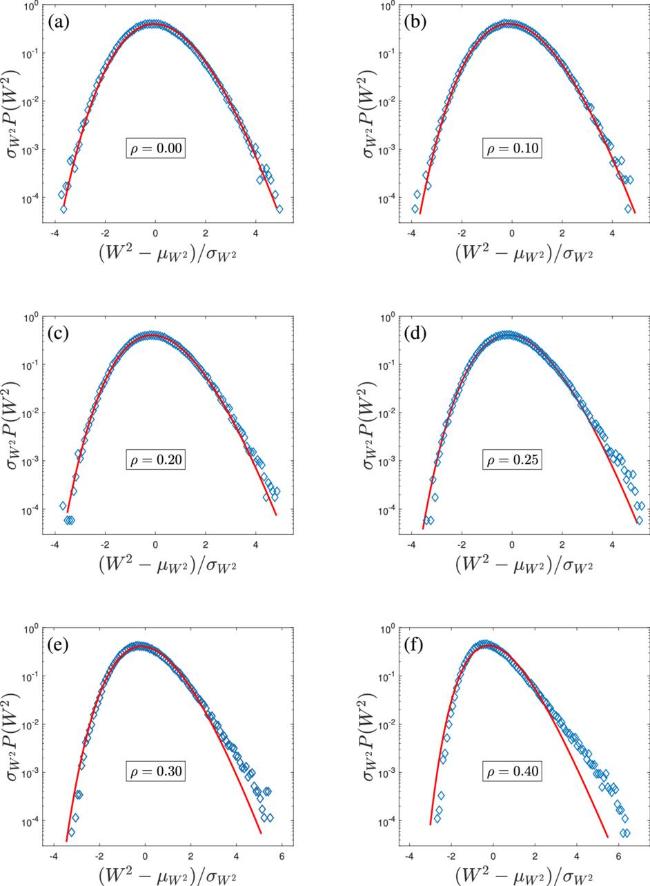Figure 6. The rescaled distributions for W2(L, t) in the spatially correlated KPZ system with different ρ: (a) ρ = 0.00, (b) ρ = 0.10, (c) ρ = 0.20, (d) ρ = 0.25, (e) ρ = 0.30, (f) ρ = 0.40. Here, ${\mu }_{{W}^{2}}$ and ${\sigma }_{{W}^{2}}$ represent the mean value and standard deviation of W2, respectively. All data are averaged over 105 independent realizations. Comparison with lognormal distribution (red solid line) is provided correspondingly. |