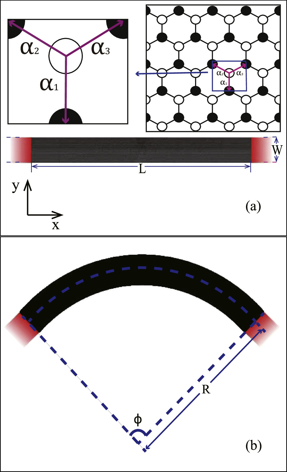 48] have confirmed that when the width of graphene nanoribbons exceeds 1.5 nm, stable bending occurs for curvatures below 2 deg/nm. For the largest bending angle