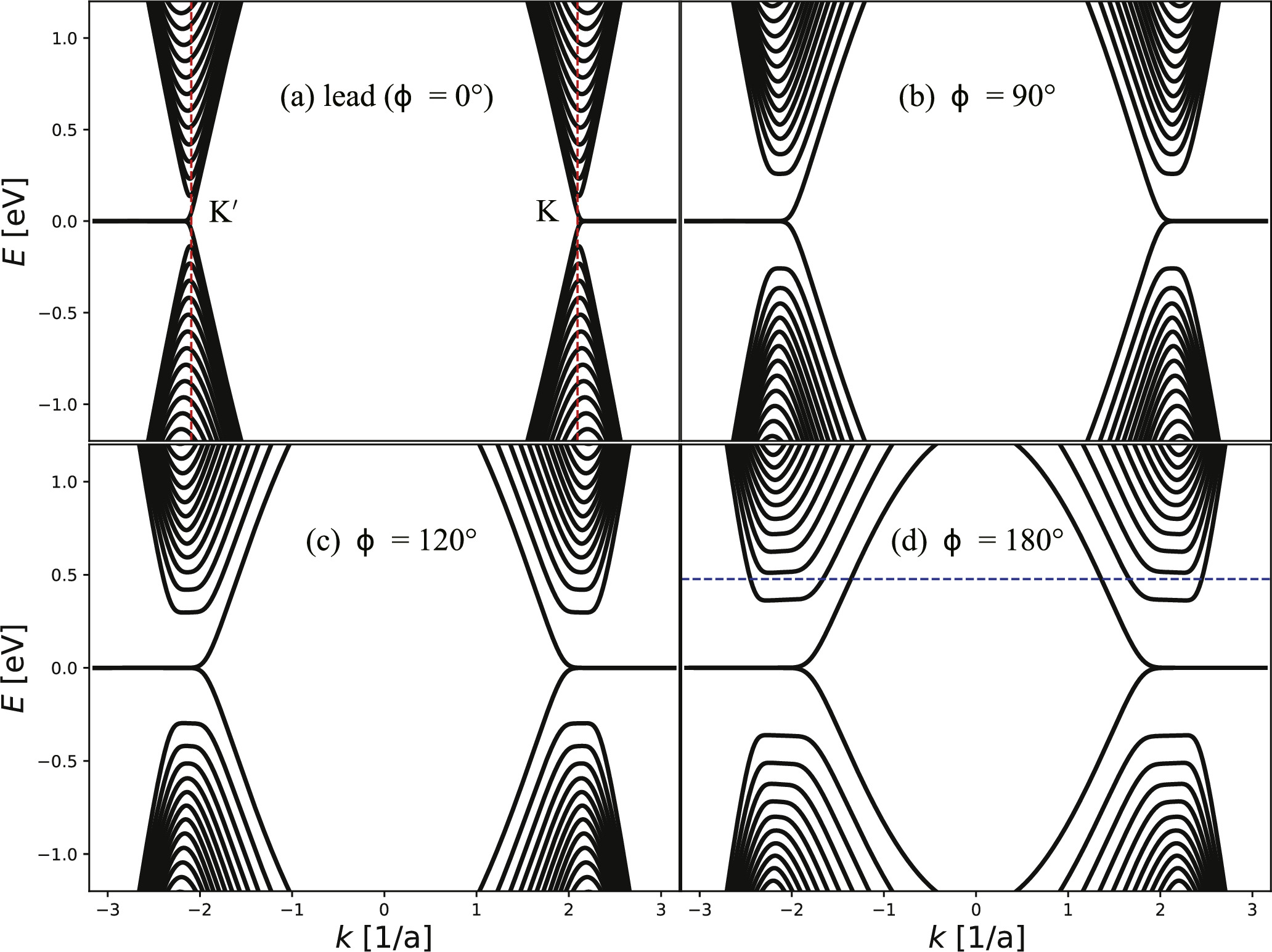 k) and exhibit particle-hole symmetry. In the lead region, there exist a series of conduction/valence subbands with minimum/maximum near the
