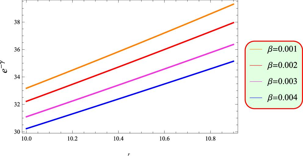 The previous analysis indicates that the interior region’s solution is devoid of singularities, effectively overcoming the singularity problem commonly found in conventional black hole models. To graphically plot the factor (20), we need to make the interior charge a known quantity. It has initially been taken as $q(r)={q}_{0}{\left(\frac{r}{R}\right)}^{n}$ with n and q0 being constants, and R denoting the object’s boundary [75]. Later, a new form of this quantity has been suggested in which n was fixed to be 3 and $\beta =\frac{{q}_{0}}{R}$; it therefore takes the form q = βr3. This choice has widely been used in the literature to simplify the governing equations characterizing charged fluid distributions [76–78]. Figure 1 shows the singularity-free increasing behavior of the component (20) for distinct values of β. To examine the active gravitational mass of the inner sector, we employ the following equation