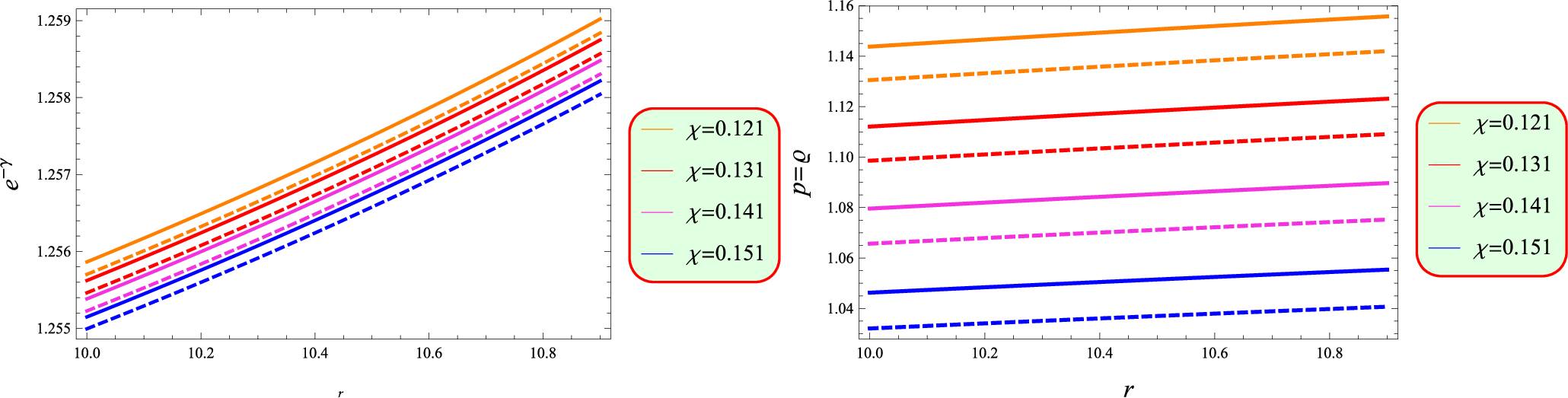 where $\varpi =A\left(48{\chi }^{3}+28{\chi }^{2}-1\right)$. Here, the integration constant is denoted by C, and the radius r lies within the interval R1 = R < r and R2 = R + ε > r along with the considerations ε ≪ 1 and e−γ ≪ 1. Figure 2 shows how the metric potential eγ behaves consistently over the intermediate shell r. By substituting the EoS p = ϱ and (26) into (17), we derive the expression for density (such that density = pressure) as follows