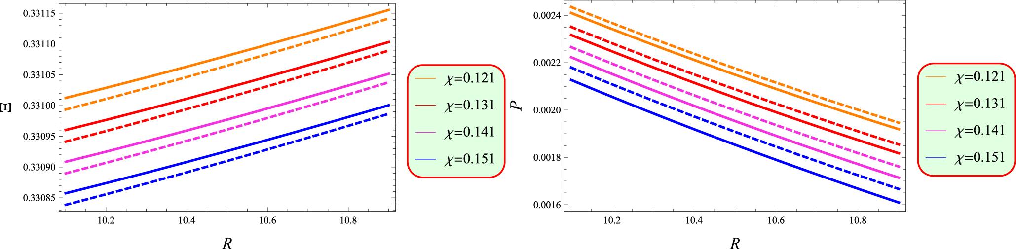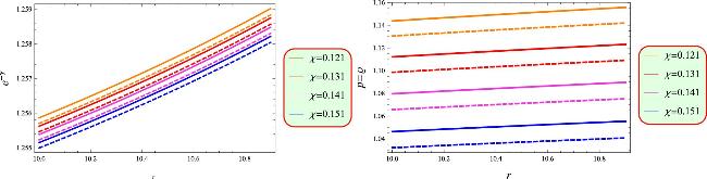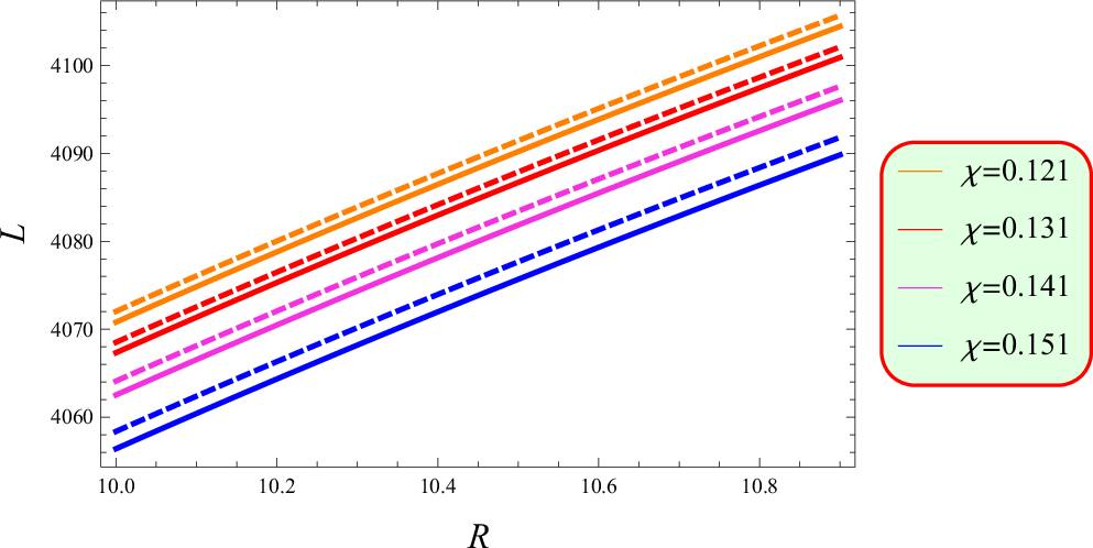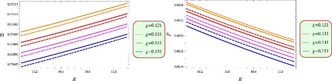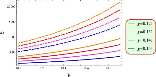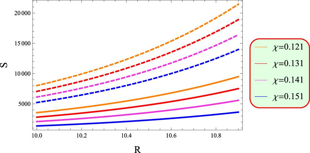 Analytically solving the above equation is difficult, so we turn to a numerical approach. Figure 5 illustrates that the entropy of the gravastar shell rises with increasing shell’s radius, reaching its maximum value at the outer surface. The entropy is influenced by higher charge density and local temperature variations, potentially enhancing the gravastar’s stability. Moreover, the higher values of χ and the charge also lead to the greater entropy in the context of Rastall theory.