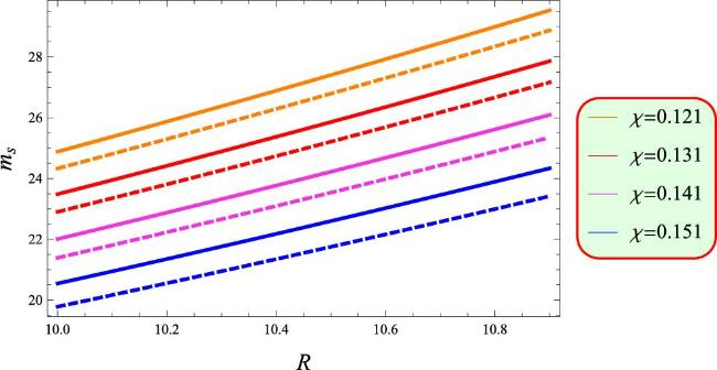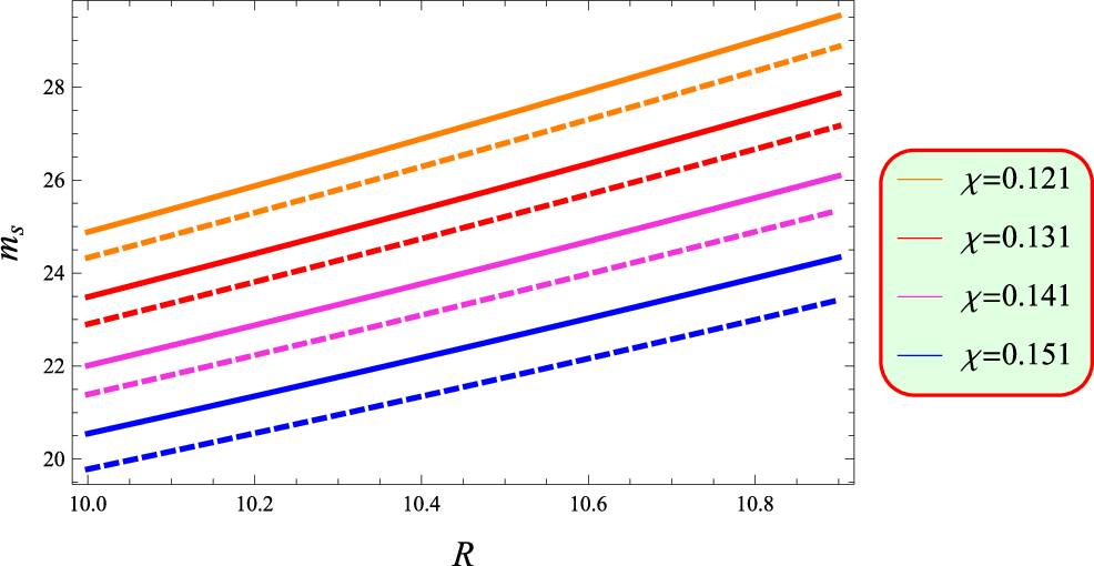 Figure 7 displays the rising profile of the thin shell’s mass against R, emphasizing a physically viable feature of compact stellar objects. The total mass M of the gravastar, in relation to the thin shell’s mass ms, is expressed as follows