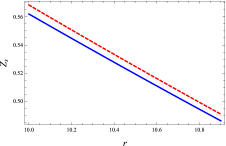 Examining the surface redshift of a gravastar is essential for evaluating its stability. To calculate the gravastar’s gravitational surface redshift, we use the formula ${Z}_{{\rm{s}}}=\frac{{\rm{\Delta }}\lambda }{{\lambda }_{{\rm{e}}}}=\frac{{\lambda }_{0}-{\lambda }_{{\rm{e}}}}{{\lambda }_{{\rm{e}}}}$, where λ0 is the wavelength emitted by the source and λe is that detected by the observer. According to Buchdahl’s proposal [93], an isotropic, stable, ideal fluid distribution should have a surface redshift of not more than 2. However, Ivanov [94] stated that it might become up to 3.84 for the anisotropic fluid setup. Moreover, Barraco and Hamity [95] demonstrated that for an isotropic fluid distribution without the cosmological constant, the condition Zs ≤ 2 is satisfied. In our case, we define the surface redshift given by