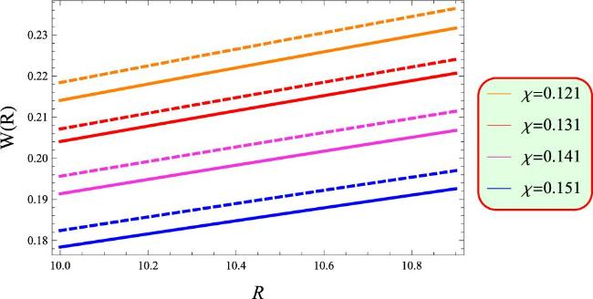 The EoS parameter shows an acceptable profile under certain conditions, such as $\frac{\kappa {\varrho }_{{\rm{c}}}}{3}\left(1+\frac{4\chi }{4\chi -1}\right){R}^{2}-\frac{\kappa {Q}^{2}}{{R}^{2}}\lt 1$, which helps to maintain the real value of W(R) (figure 8).