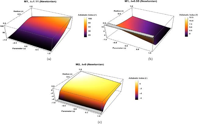 Here, we analyze the physical instability of axially symmetric geometries under a specific f(R, T) theory description, which is represented as: f(R, T) = R + λR2 + ηT, where λ, and η are arbitrary parameters [96]. The main objective of this study is to examine how the Γ behaves in both the N and pN domains, while Γ is a crucial parameter that characterizes the thermodynamic properties of configuration, influencing the evolution as well as the instability of formations. This model is confined by four arbitrary parameters in which λ is responsible for the adjustment of the curvature in the gravitational action, while η is designated as the contribution of the trace of the energy-momentum tensor. Through the manipulation of these parameters, since standard Newtonian and Einsteinian principles might not be adequate to describe matter’s behavior in severe circumstances, we might look into their effects on the dynamics of fluid structures. This is particularly relevant in the setting of alternative gravities. By using this comprehensive approach, we intend to shed light on the relationship between the specified parameters and the instability of our considered cosmic body in our gravity context. All terms in the previously established inequality (40) must be satisfied for the instability of the highly restricted axial dense structure under study, which persists into the post-Newtonian (pN) regime. Certain conditions that must be fulfilled to guarantee this for the Γ in equation (40) are stated as: