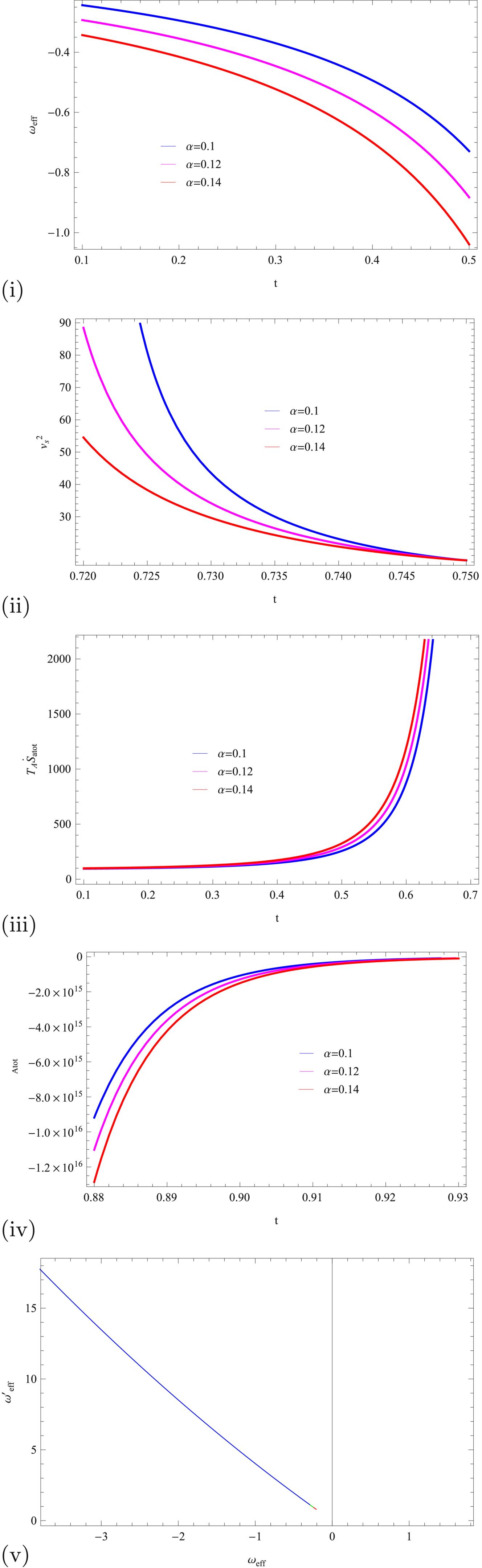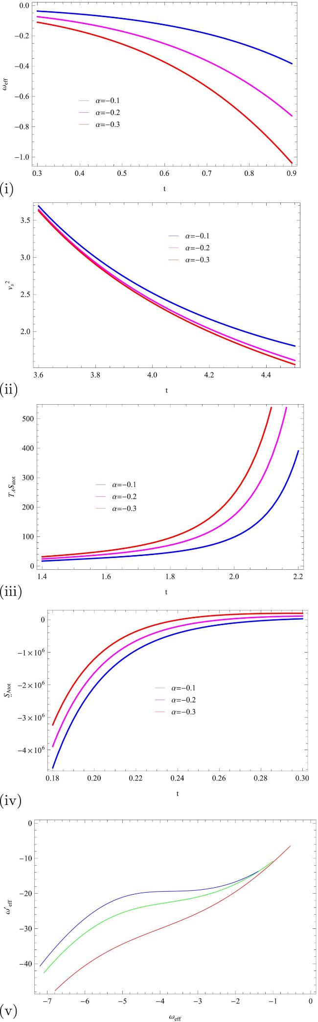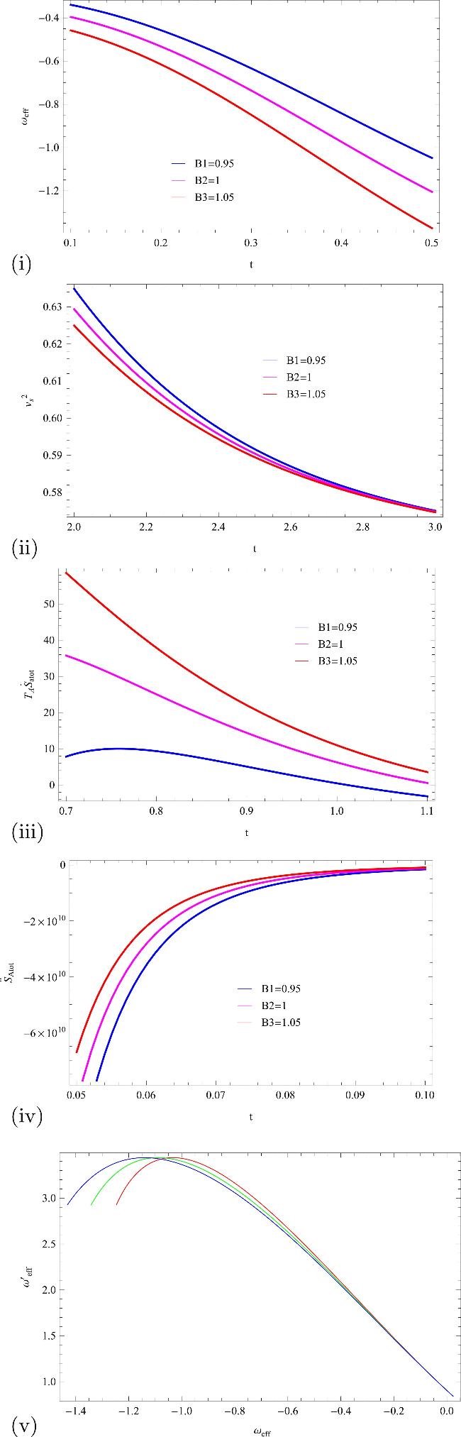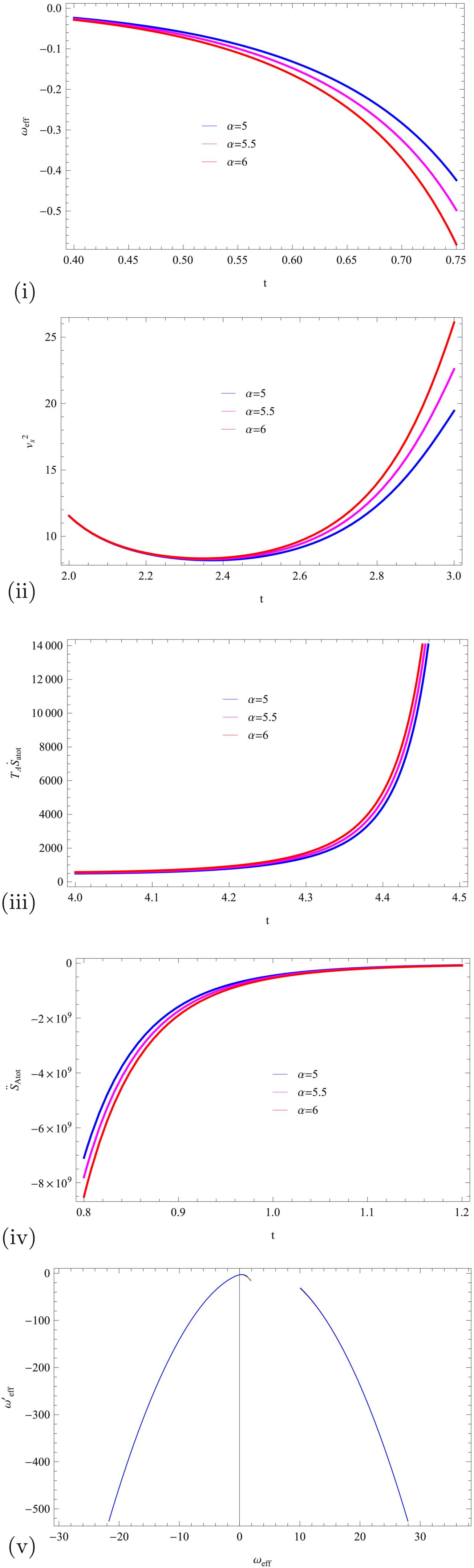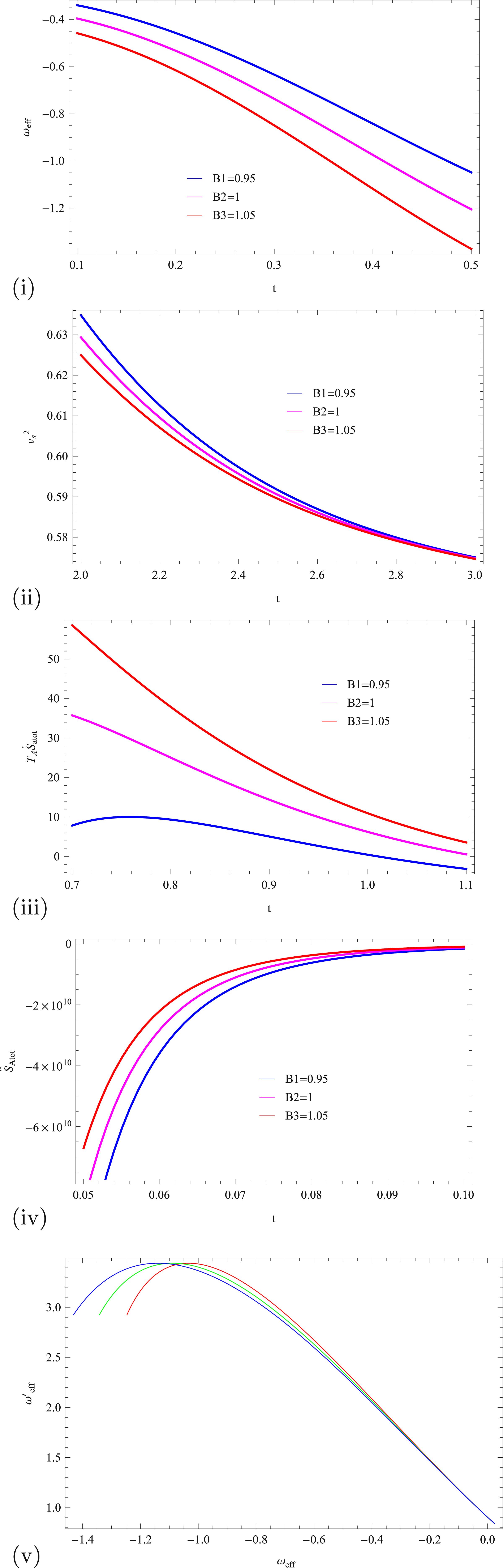 Using this expression of Hubble parameter and its derivatives in equation (2.11), we obtain the expression of ωeff. We plot the graph of effective EoS parameter against t as shown in figure 1(i) by taking α = -10, β = 0.2, ts = 1 and different values of B as mentioned in the panel. The plot shows the evolution from the quintessence era to the phantom era traversing the cosmological constant line by increasing the cosmic time t. The squared speed of sound is evaluated in figure 1(ii) using mathematical relation (equation (A1)) assuming the same constant parameters as in above figure. The graph describes the stable behavior of the underlying model on the interval 2 ≤ t ≤ 3. The GSLT model, that has mathematical expression in equation (A3) with Bekenstein entropy assuming apparent horizon as seen in figure 1(iii). It is observed from figure that GSLT is valid for this model. In figure 1(iv), the thermal equilibrium condition is checked mathematically represented in equation (A4) that leads to the system being in thermal equilibrium. Similarly, ${\omega }_{\mathrm{eff}}-{\omega }_{\mathrm{eff}}^{{\prime} }$ plane in figure 1(v), is represented to analyze the evolution of DE models. The curves show different trajectories, likely corresponding to various parameter choices or cosmological scenarios. From the plot, we observe that ${\omega }_{\mathrm{eff}}^{{\prime} }\gt 0$ for ωeff < 0 which corresponds to thawing region of the universe.