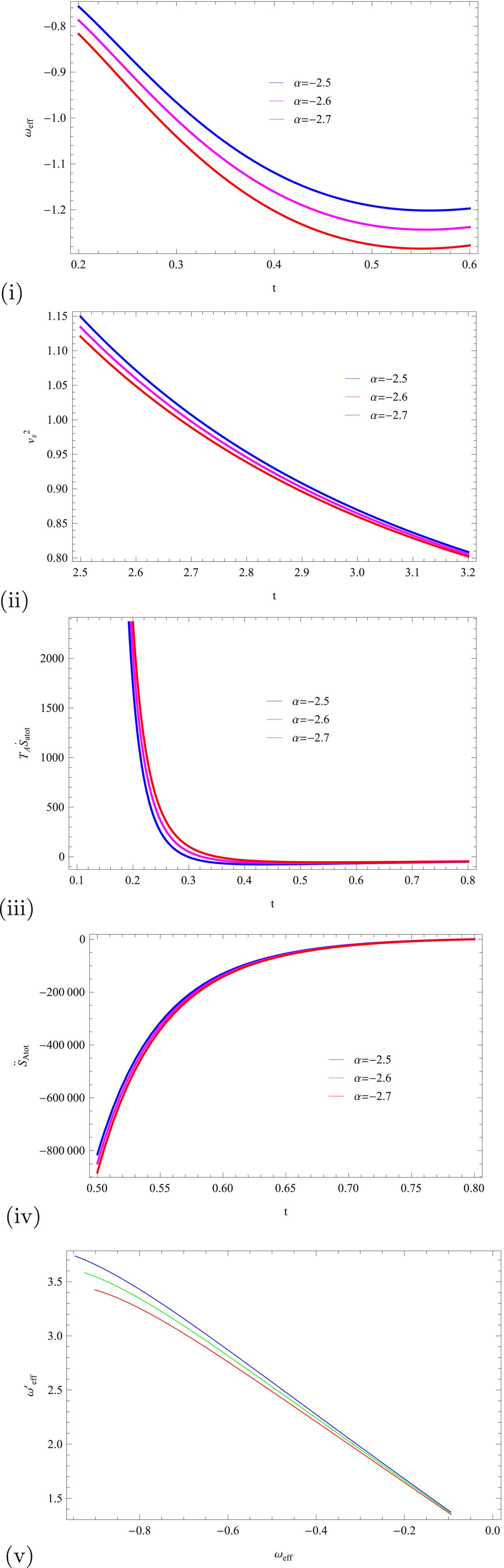 Figure 3. Plots of (i) The EoS parameter is plotted against cosmic time t, the plot exhibits the quintessence era, then transitioning to a cosmological constant phase and finally entering the phantom era. (ii) Squared speed of parameter as the function of t which lead to stability of the underlying model (iii) GSLT $({\dot{S}}_{\mathrm{tot}})$ versus t which corresponds to validity of GSLT $({\dot{S}}_{\mathrm{tot}}\gt 0)$ (iv) Thermal equilibrium which ensures the thermal stability of a system $({\ddot{S}}_{\mathrm{tot}}\lt 0)$ (v) The ${\omega }_{\mathrm{eff}}-{\omega }_{\mathrm{eff}}^{{\prime} }$ plane exhibits the freezing region. These plots are drawn for matter bounce cosmology.