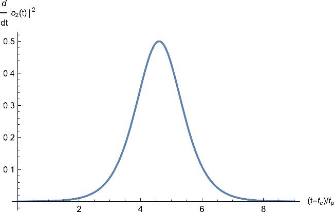 where tc denotes the beginning that hS becomes dominant and δ ≡ c2(tc). The detailed derivations are contained in the supplemental material section 4. To derive equation (7) we have used the normalizing condition |c2|2 = 1 - |c1|2. The evolution of c2 gradually changes from equation (5) to equation (7) at around tc. Equations (6), (7) together imply that tc ~ tp and so that δ = ηEtp. Under the realistic conditions, the duration of external GWs may be smaller than tp, i.e. δ < ηEtp. In the limit c2 « 1, c2(t) is proportional to ${{\rm{e}}}^{t/{t}_{{\rm{p}}}}$. The evolution of $\frac{\partial }{\partial t}| {c}_{2}{| }^{2}$ is depicted in figure 1, which is proportional to the GW radiation power. In the region to the left of the peak in the figure, where the time t is relatively small, the particle transition rate increases approximately exponentially, in agreement with the theoretical prediction of stimulated transitions. As the transition rate rises, the population of particles in the |$\Psi$1 state decreases significantly, thereby suppressing further growth of the transition rate and resulting in the peak observed in figure 1. Figure 1 also indicates that most of the energy released into GWs within the period comparible to tp. Intuitively speaking, external GWs play the role of a kindling that ignites the system. Although the BH does not absorb the particles in |ψ1 state, the cloud is an unstable system because of the self-generation of GWs. Equation (7) also implies the total time from the initiation of external GWs to the termination of stimulated transitions